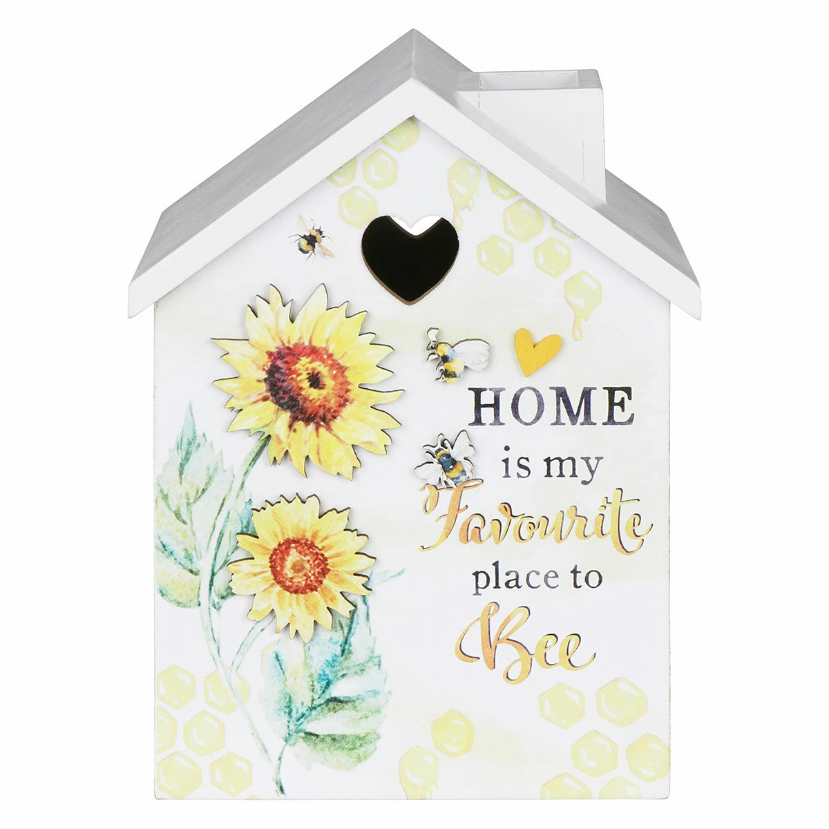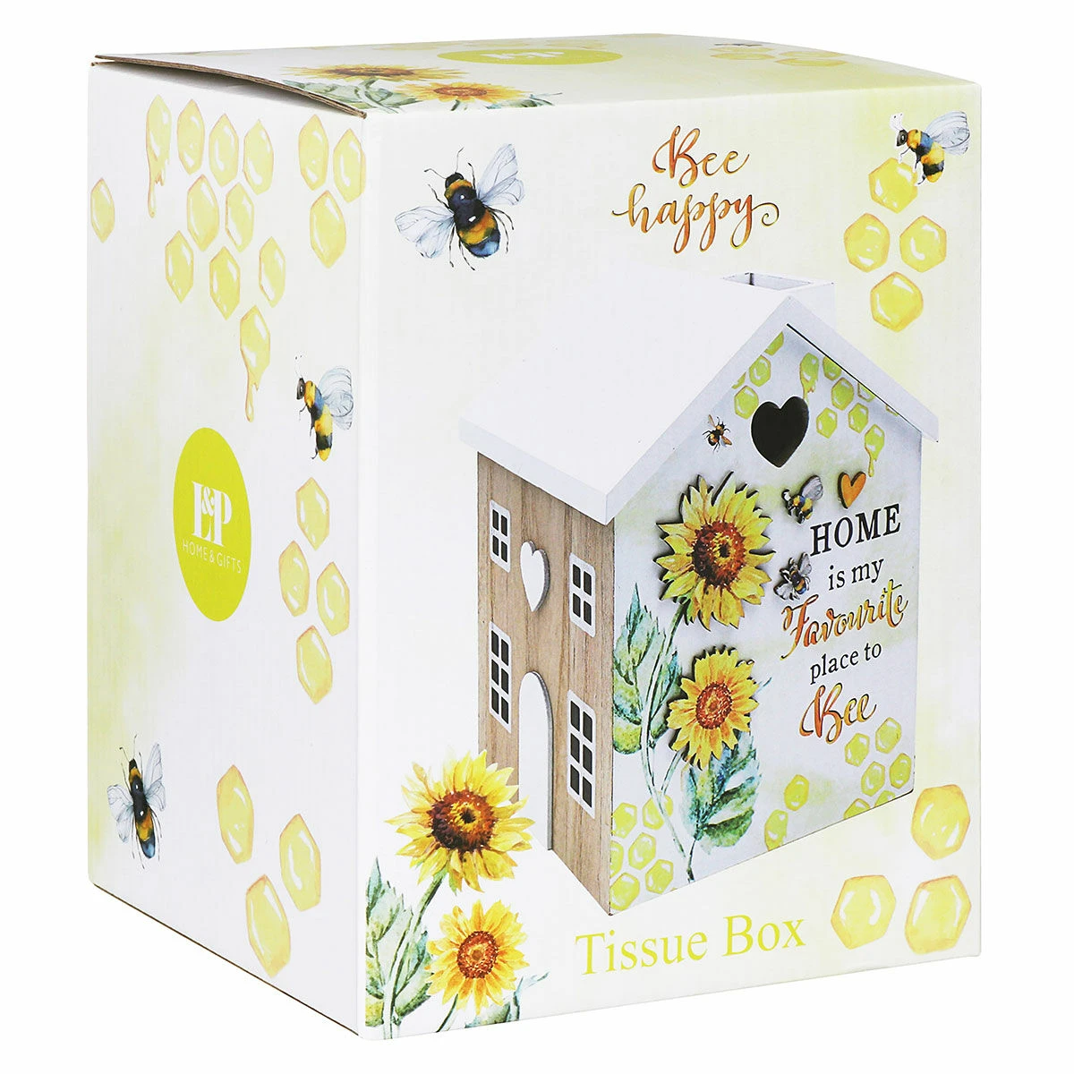 The tissue box is made from wood and is shaped like a house. The front is painted white with decorative honeycomb, bees and foliage, with text that reads;