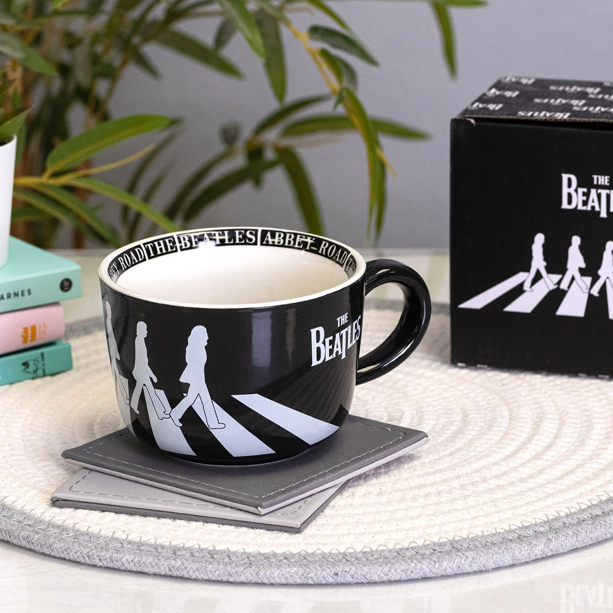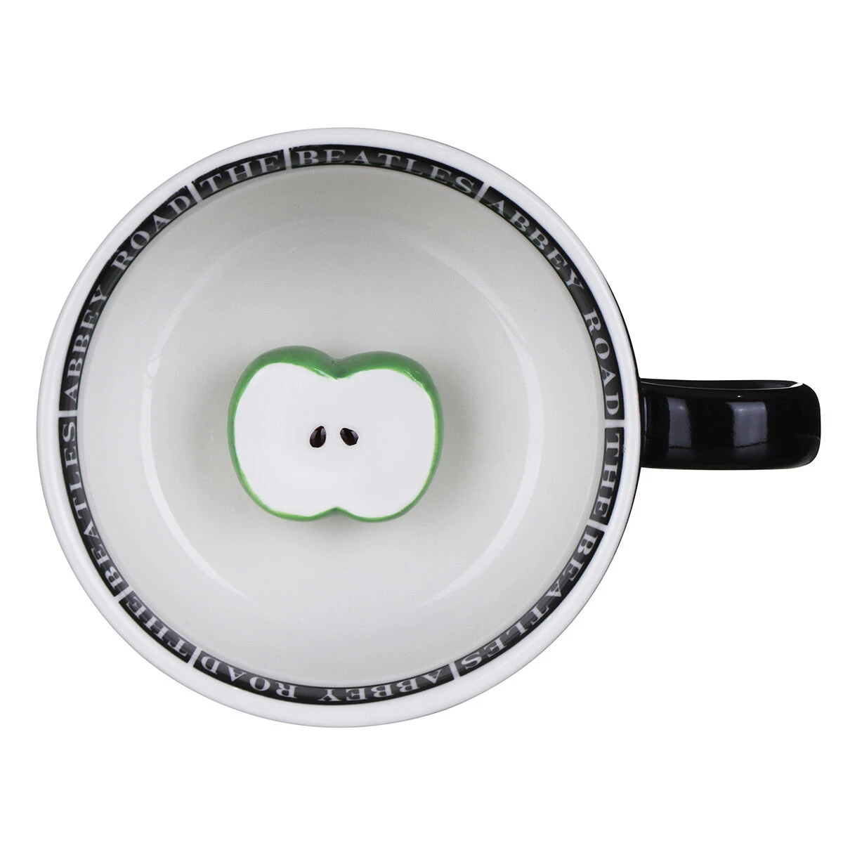 This stunning porcelain mug is decorated with the stylish ‘Abbey Road’ album cover from The Beatles in striking monochrome. The short wide mug is adorned with the words ‘The Beatles Abbey Road written inside the rim, whilst inside the base of the cup is half an apple, representing the corporation they set up, waiting to be seen once you finish your drink.