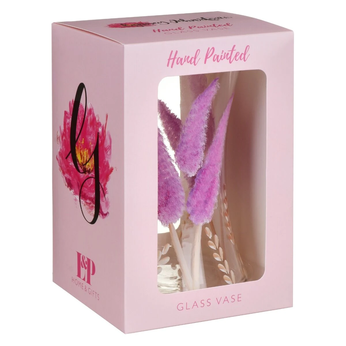 Adorning this magnificent glass vase is a plethora of vibrant purple pampas and wheat grasses. The illustrations are all hand painted and were designed by the artist Lynsey Johnstone that make this vase look exquisite.