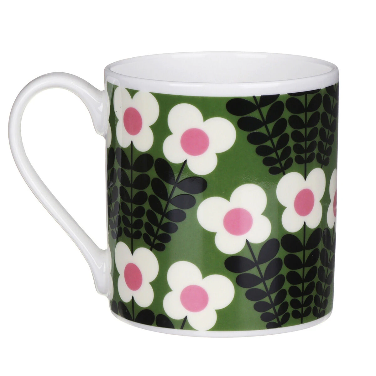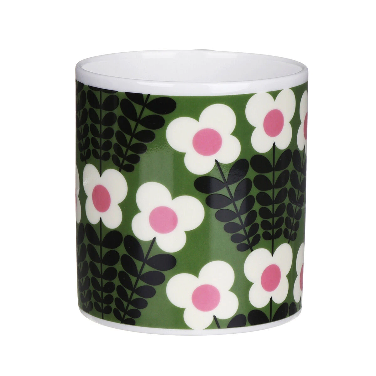 This stylish mug features the ‘Bunch of Stems’ design by Orla Kiely; three stems of leaves fan out creating an arrangement, each stem is topped with a white four petal flower with a pink centre. The bunch repeats around the edge of the mug set against a green background making the design stand out. Add a retro vibe to your kitchen with the simple design of this big mug that will fit into any scheme and particularly suits a modern kitchen!
