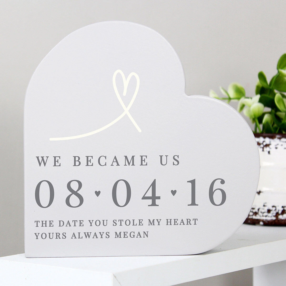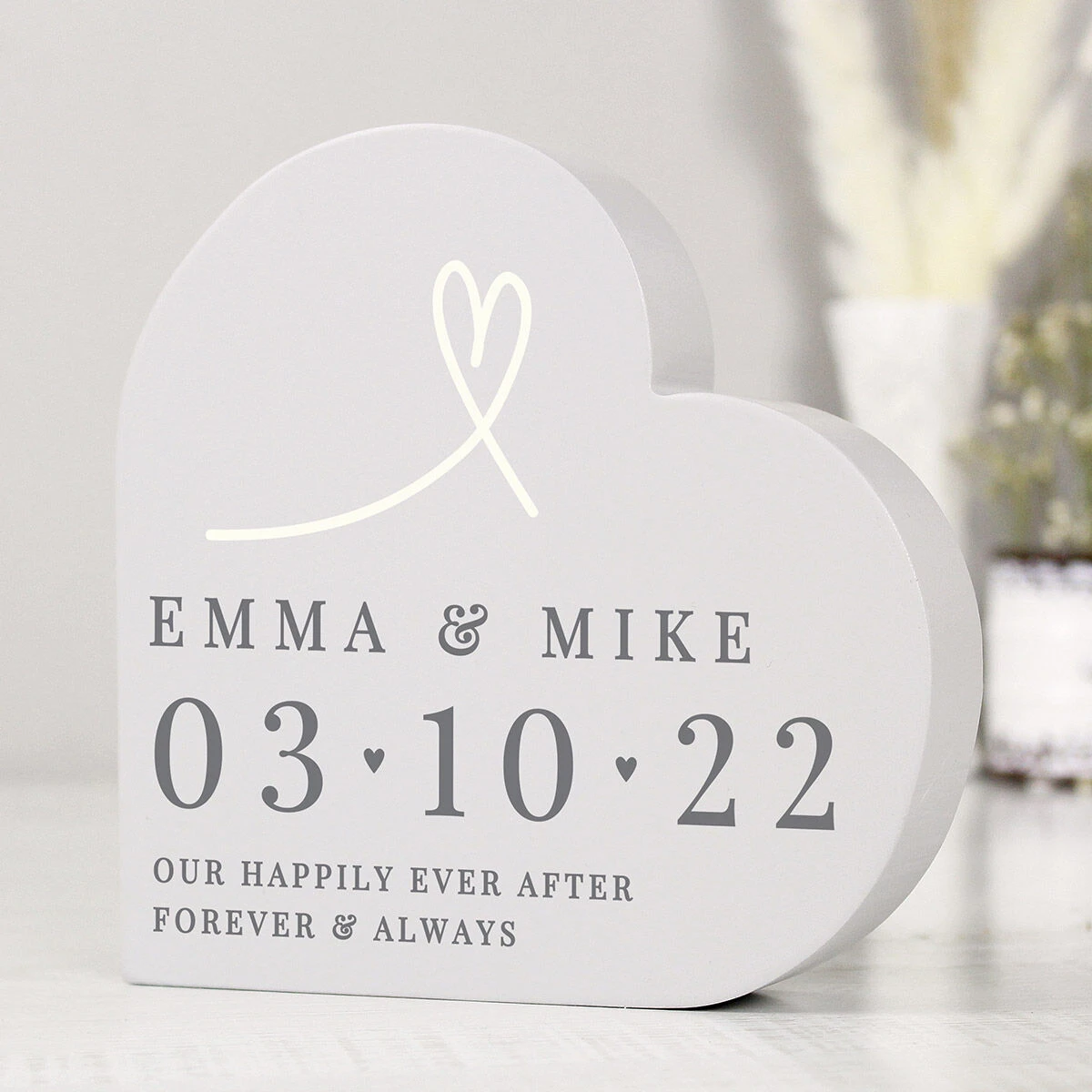 Made it the shape of a heart, the painted grey wooden ornament can be personalised with a message and date over four lines of text, for that personal touch that any recipient is sure to adore!