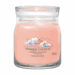 Enjoy the gorgeous Watercolour Skies fragrance in the wonderful Signature Medium Jar Candle, a sleek glass vessel that compliments the fragrance and will look wonderful in your home. The wonderful fragrance from Yankee Candle will make you picture the spectrum of colours that appear in the summer skies.
